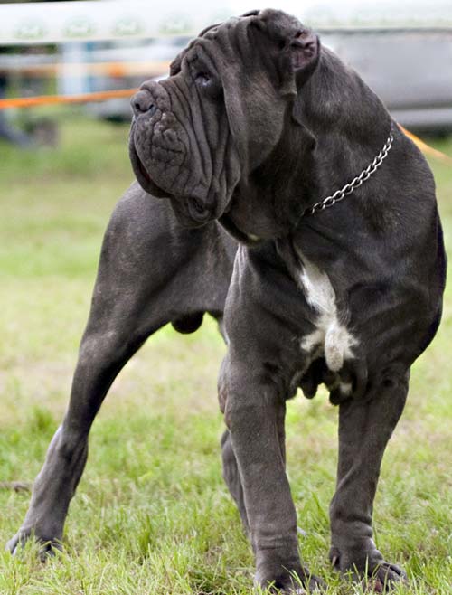 The Neapolitan Mastiff, characterized by its loose, wrinkled skin and substantial size, is not renowned for its elegance but rather its formidable presence. Its eyes, harmonizing with its coat color, often present a striking appearance.