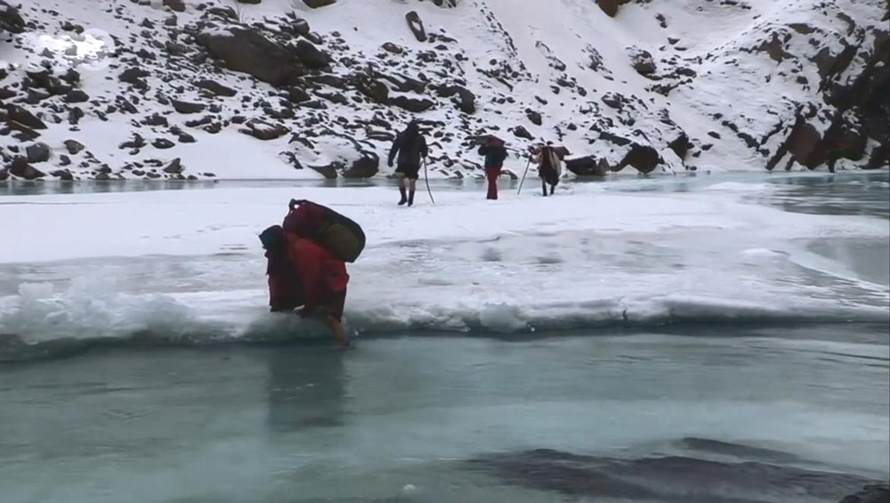 時間已經來到了中午,他們倚坐在岩壁上進行了短暫的修整。而接下來要面對的困難陡然升級,氣溫讓冰層融化成了碎冰碴子。孩子們根本挪不開腳步,他們只能一邊用木棍攙扶著,一邊漫步向前。眼看前方的冰水越來越深,為了不打濕長棉褲,他們毫不遲疑的脫下長褲,在刺骨的冰水中艱難邁步。等到他們來到了河的對岸時,雙腿早已失去知覺。