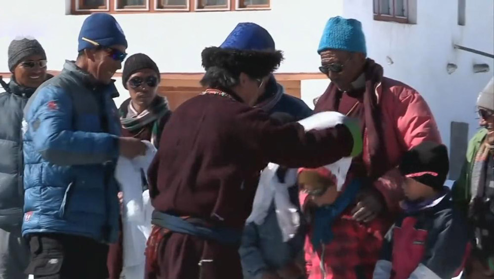 村友肯魯普也一起去學校。叔叔擔心他在學校沒有錢花,貼心地給他準備了零花錢。昂圖倆爺孫和其他14名家長和學生一同來到了村口集合,村委給他們舉行了盛大的踐行儀式。就這樣,他們這一群全村人的希望,帶著大家的期待,浩浩蕩盪就出發了。